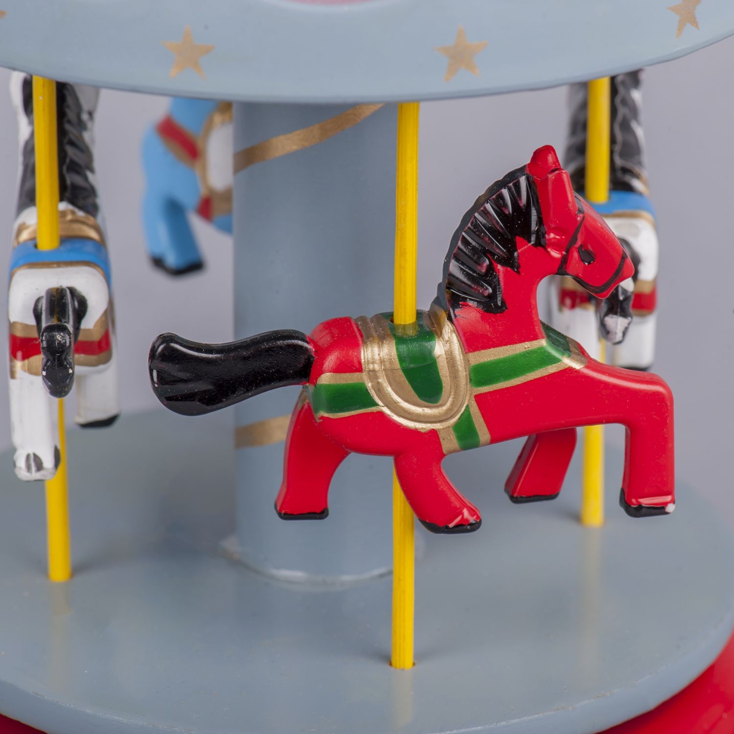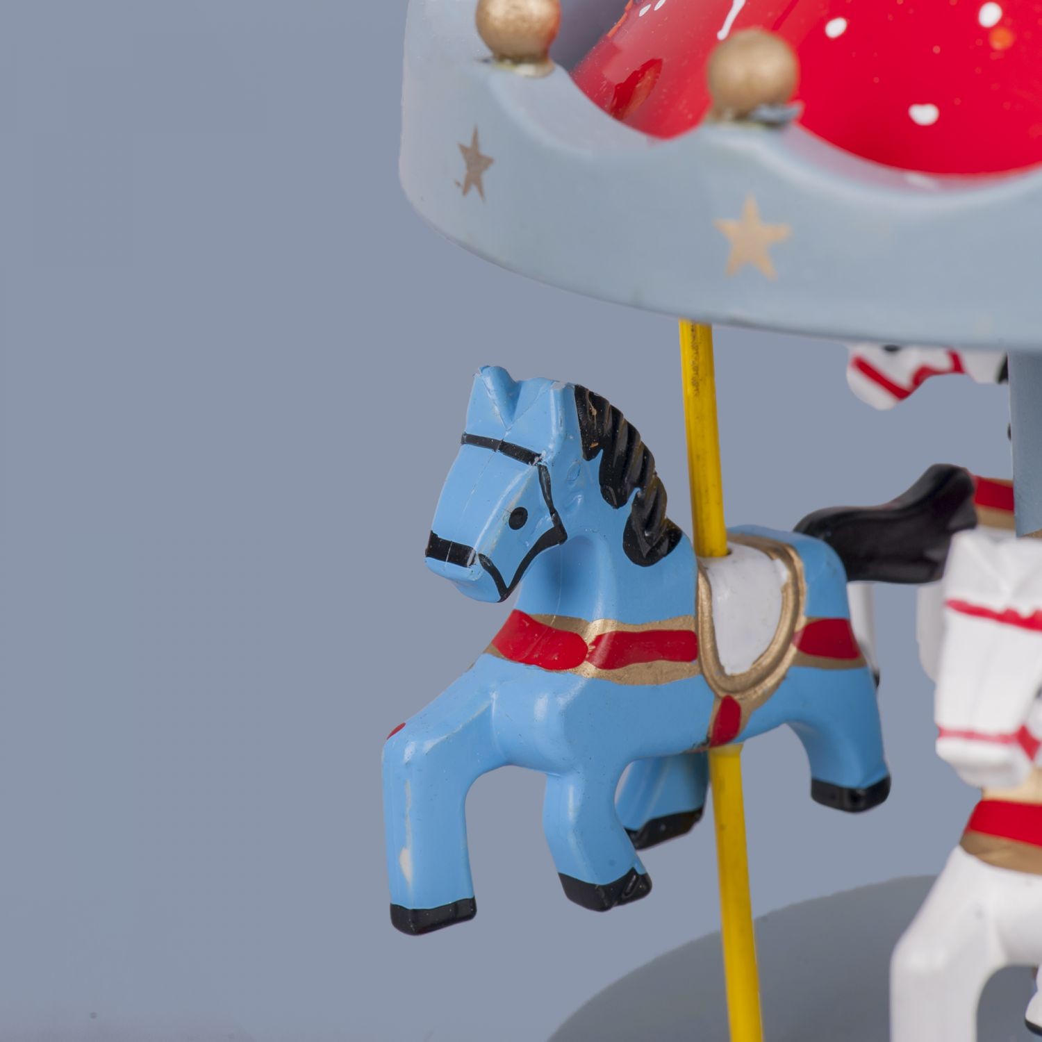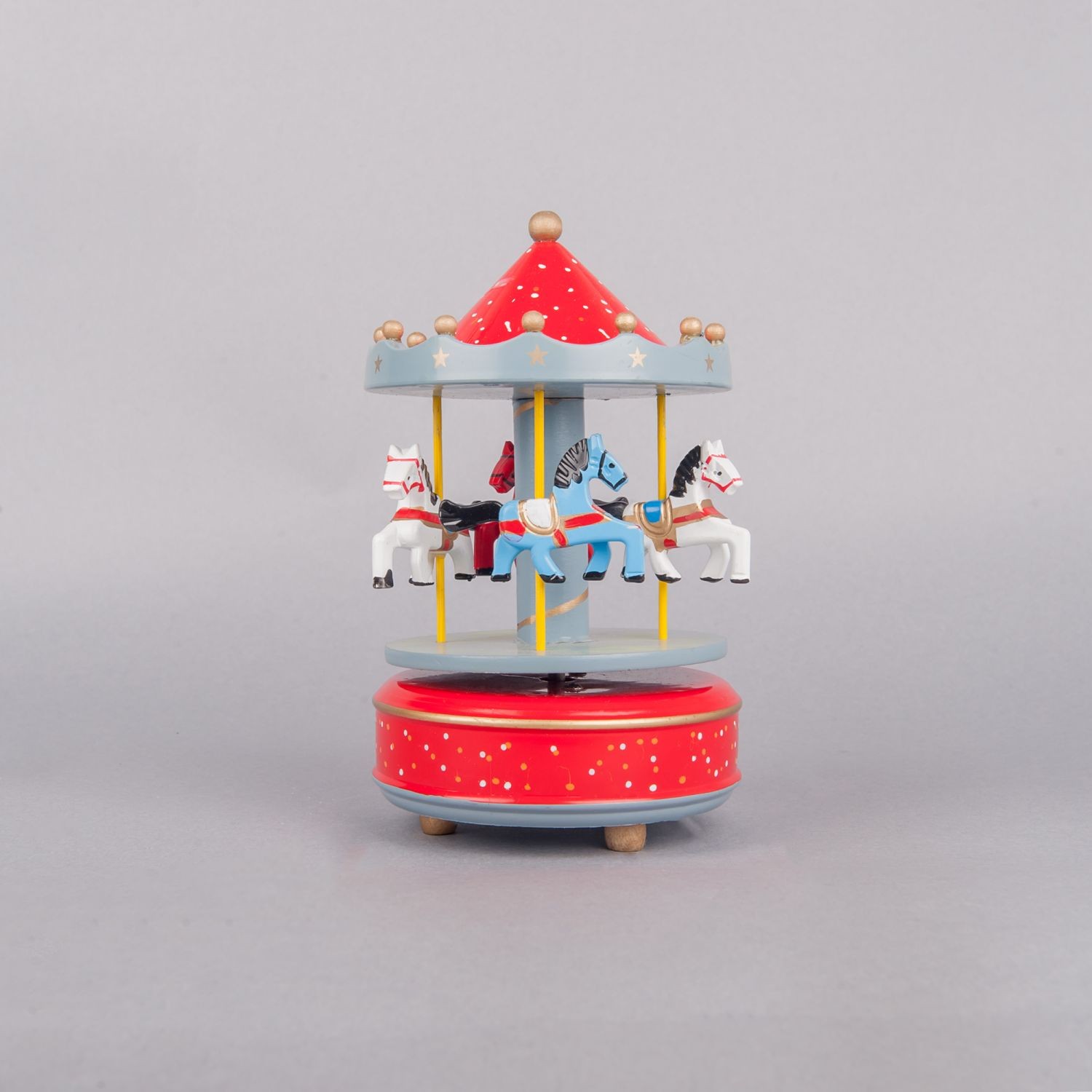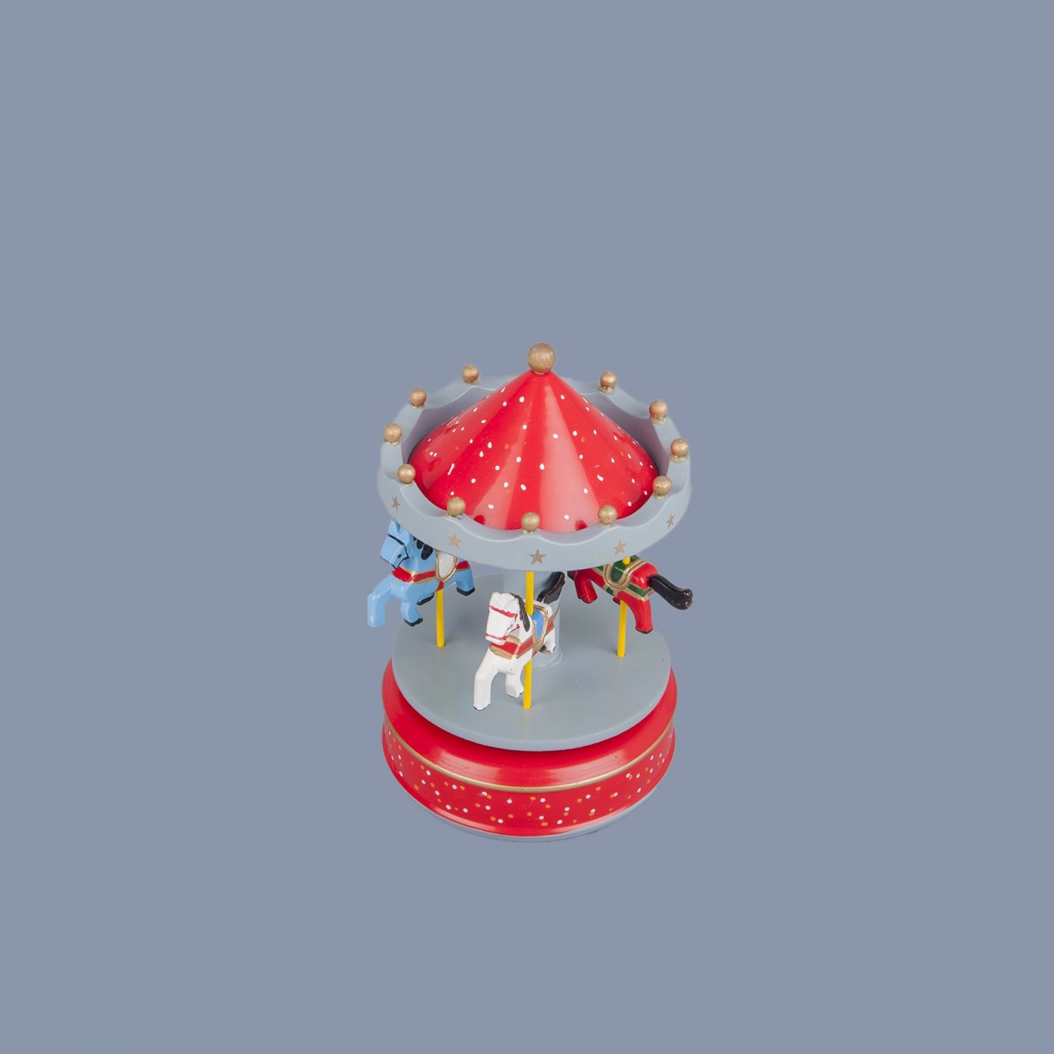 Se poate spune despre carusel ca este printre jucariile preferate ale oricarui copil de varsta mica si o amintire de durata pentru un copil mai mare. Caruselul in nuante de rosu si gri are patru caluti simpatici in nuante de rosu, alb si albastru.