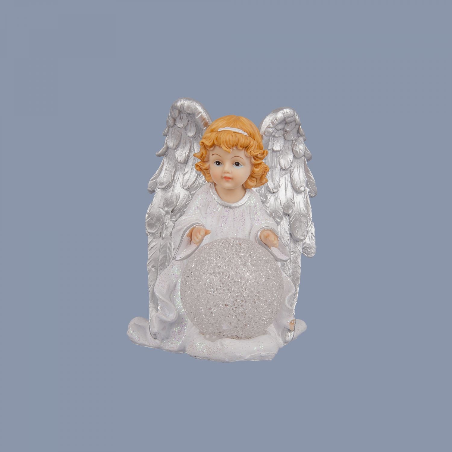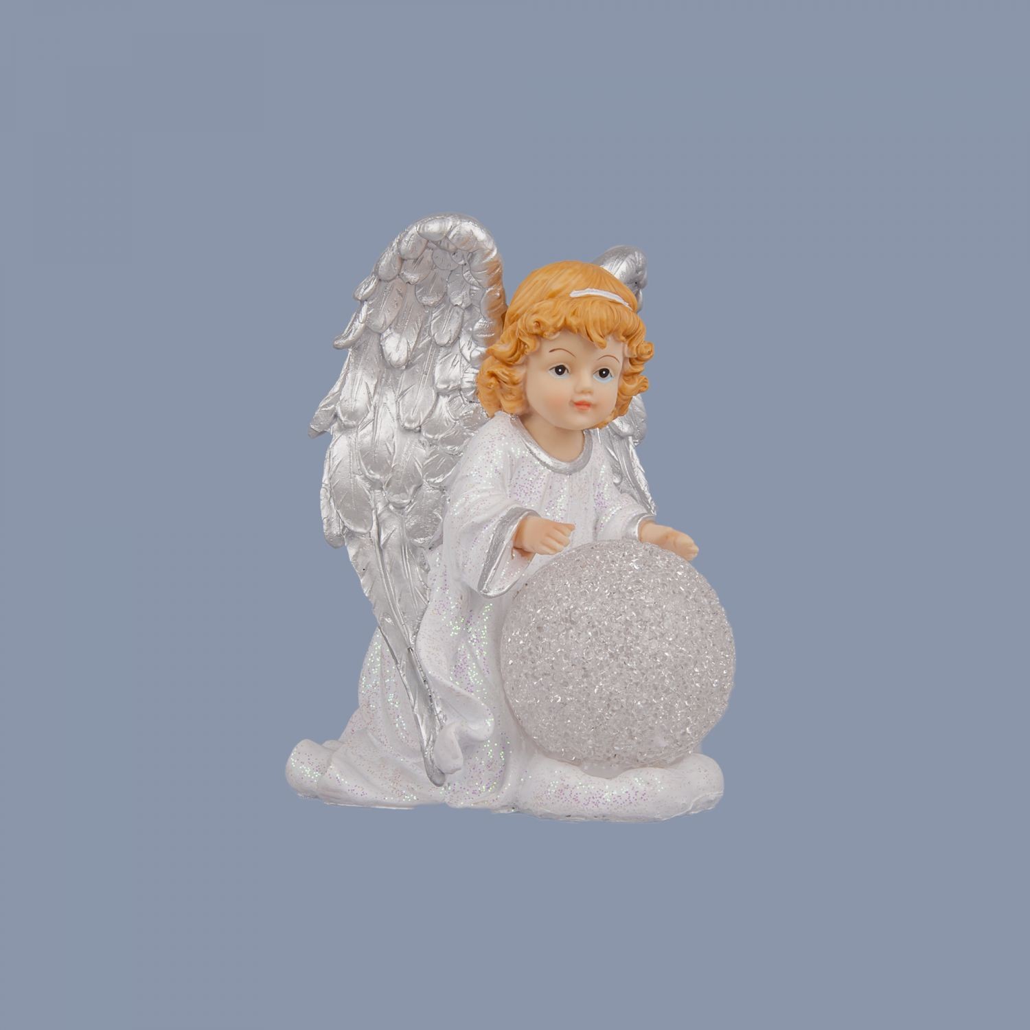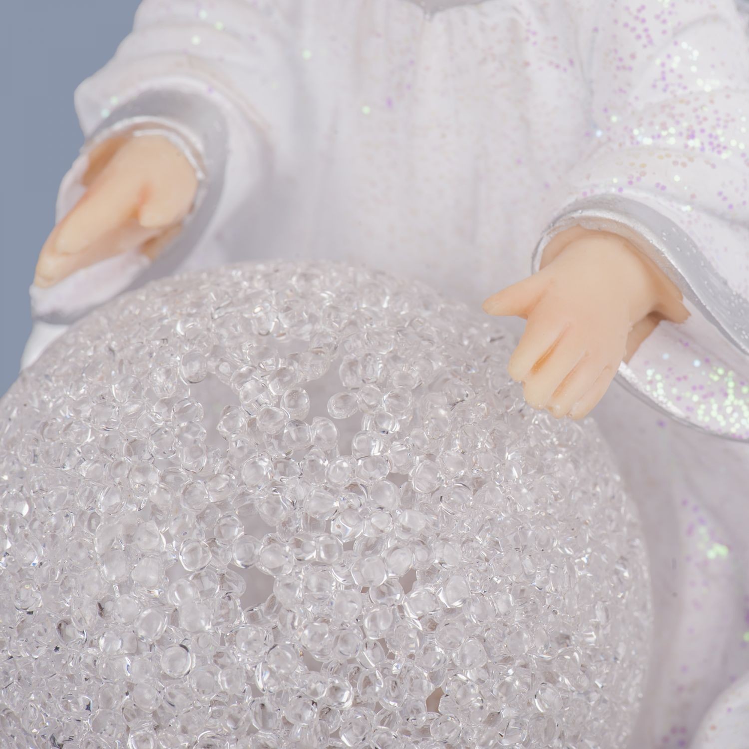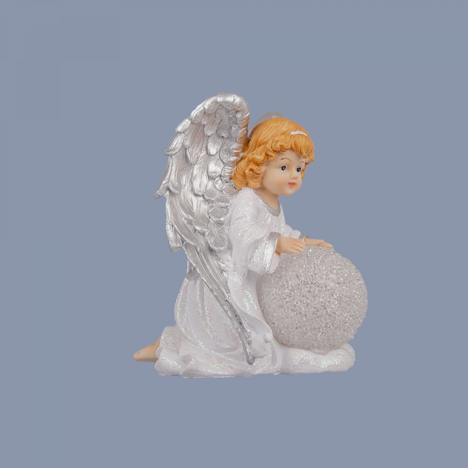 Statueta cu vesminte albe si aripi larg deschise are parul buclat. Fetita ingeras sta in genunchi cu globul si cu mainile deasupra globului.