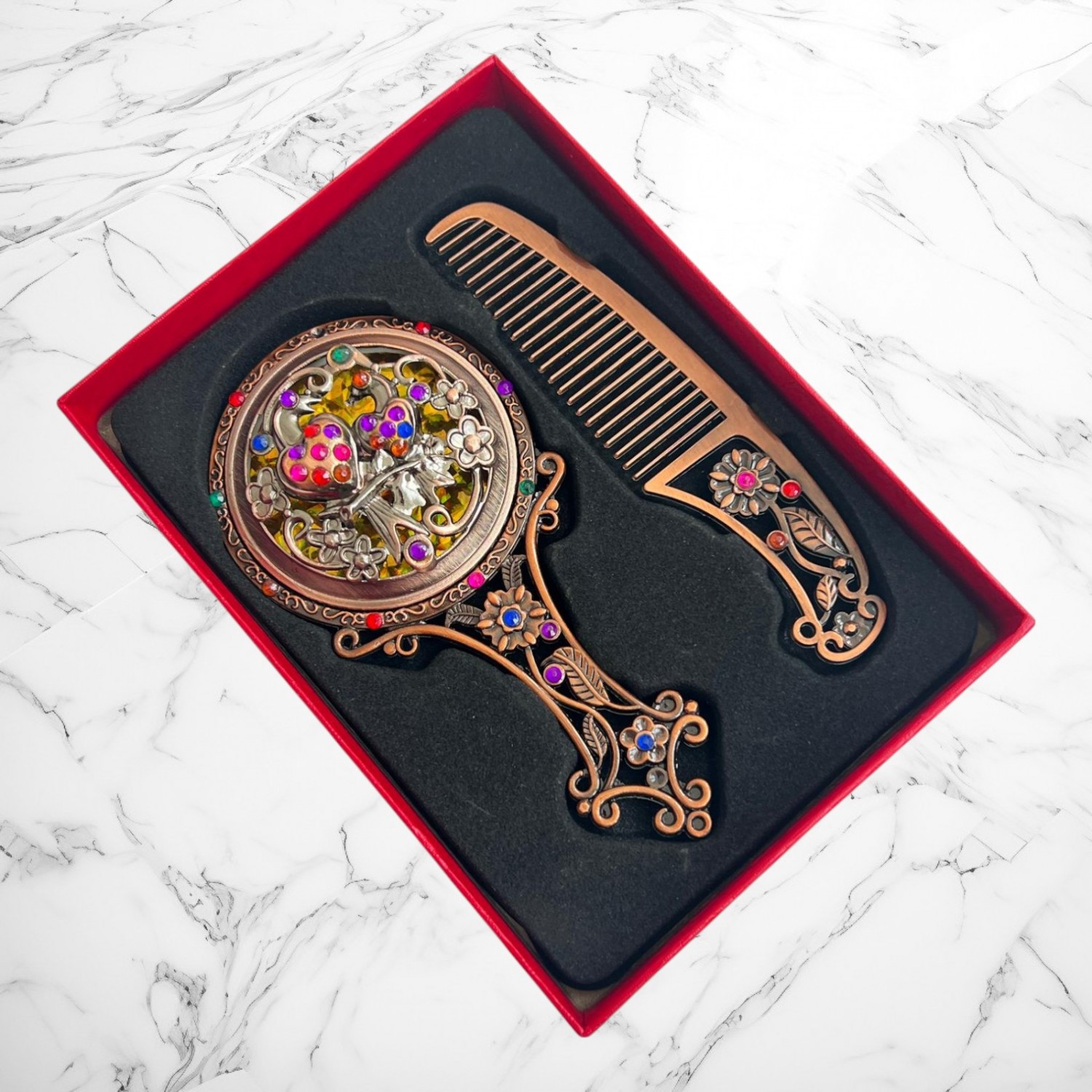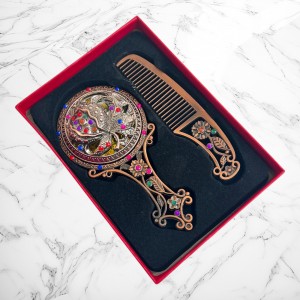 ✨ Pieptăn metalic asortat, cu decorațiuni florale și inserții colorate, perfect pentru folosire simbolică sau decorativă