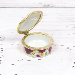 Cutia rotunda din ceramica cu model floral este potrivita pentru prima suvita a bebelusului. Aceasta poate fi pastrata si ca piesa de mobilier.