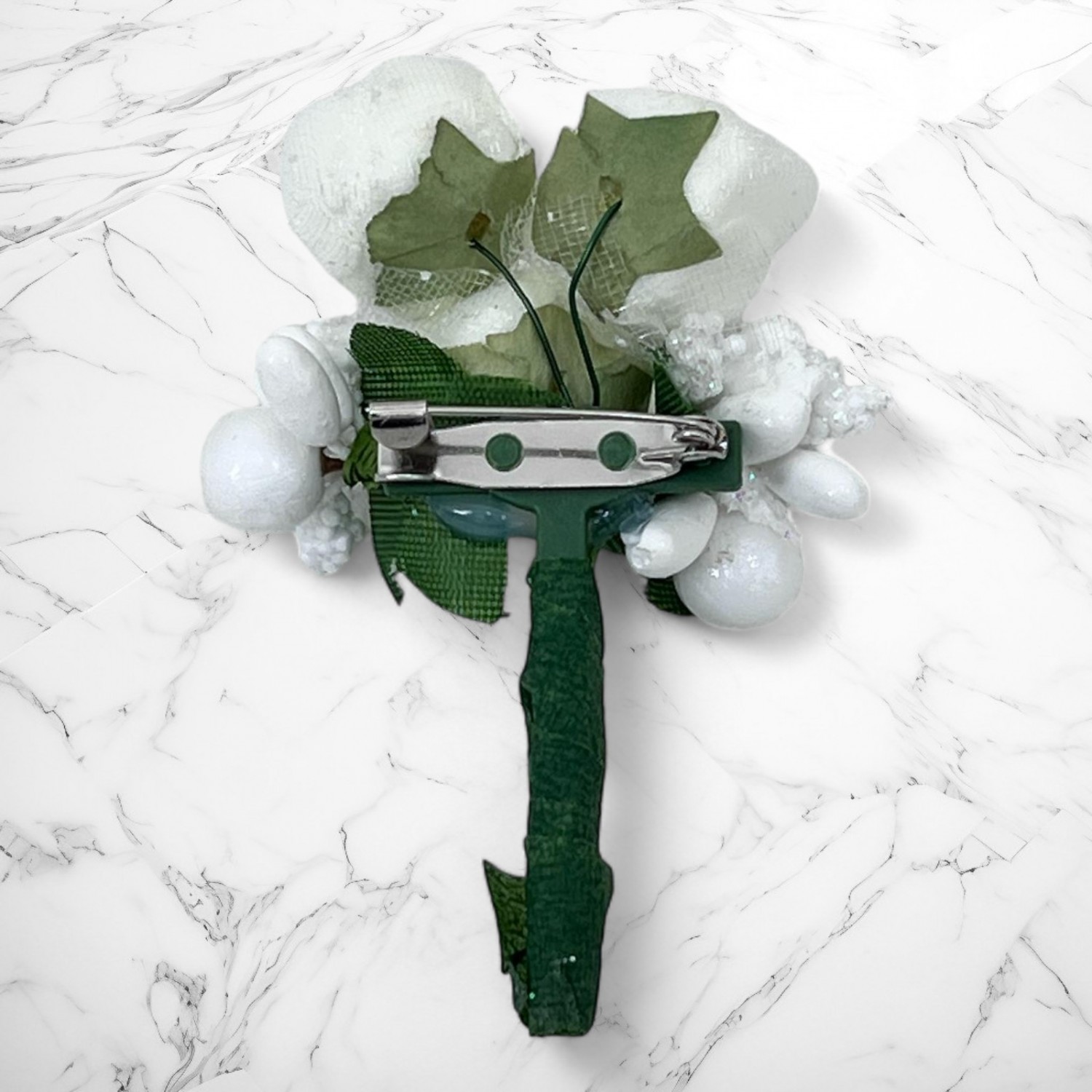 Cocarda este realizata din trandafiri artificiali de culoare ivory, accesorizati cu ghiocei.