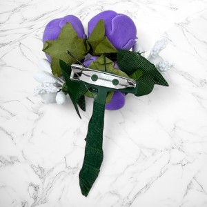 Cocarda este realizata din trandafiri artificiali de culoare lila, accesorizati cu ghiocei.