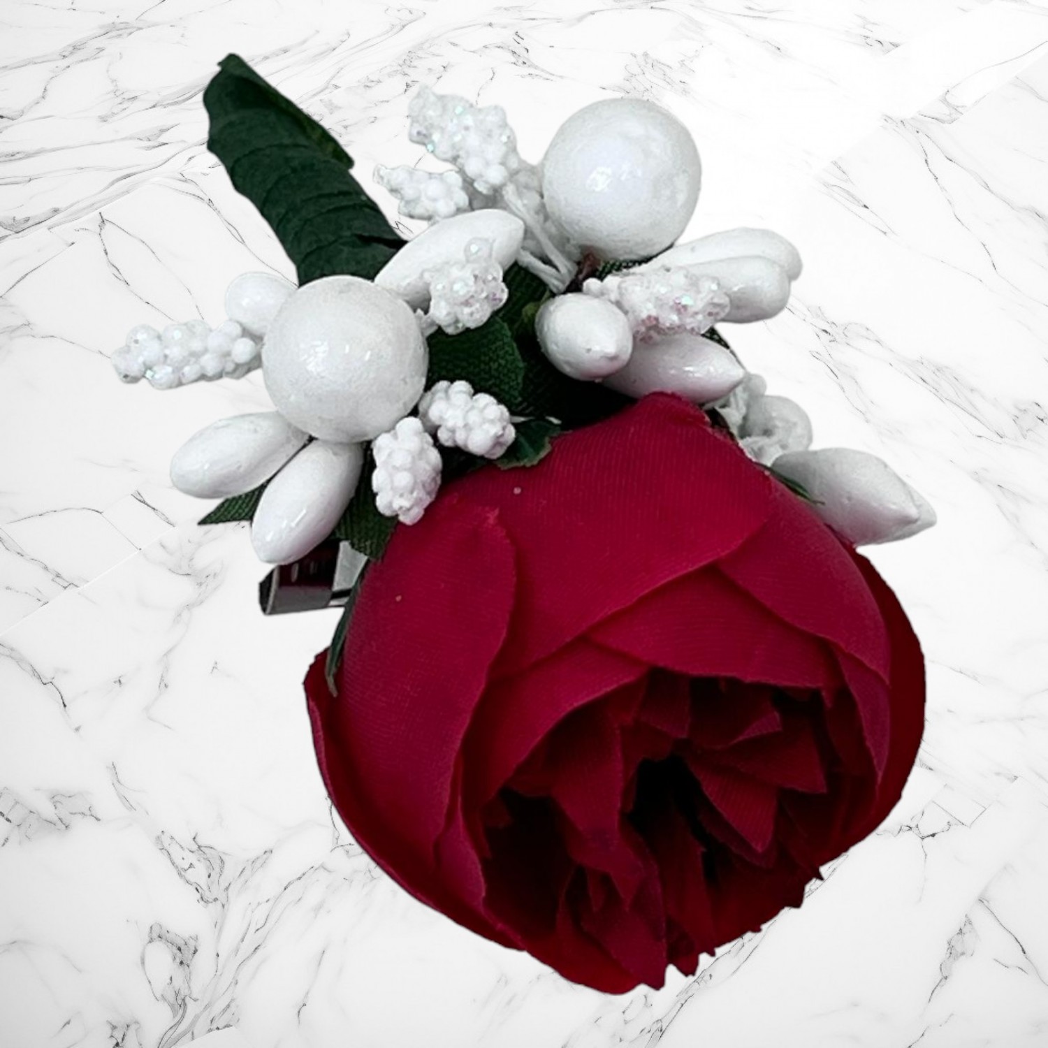 Aceste cocarde realizate din flori artificiale de bujori rosii sunt accesorizate cu ghiocei.