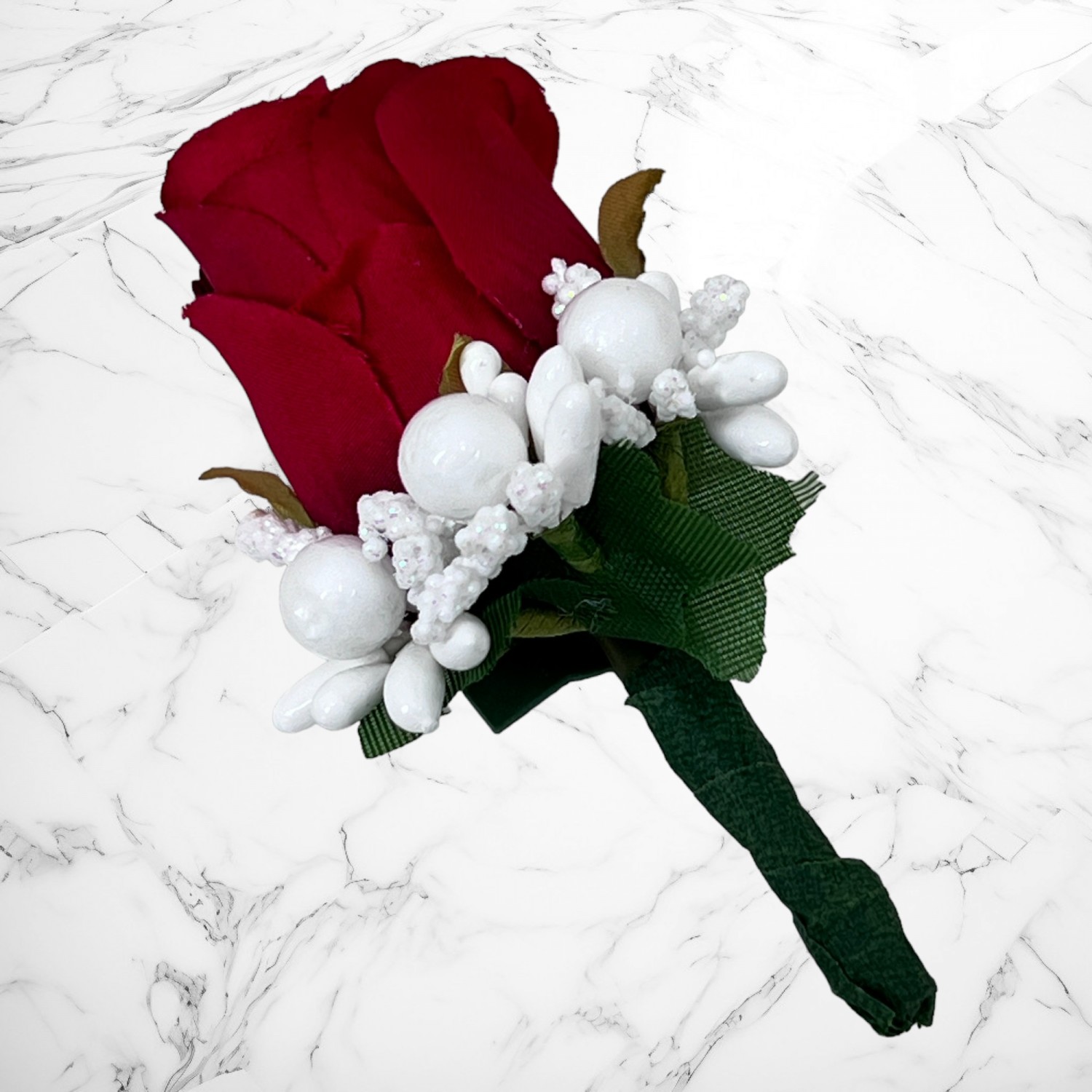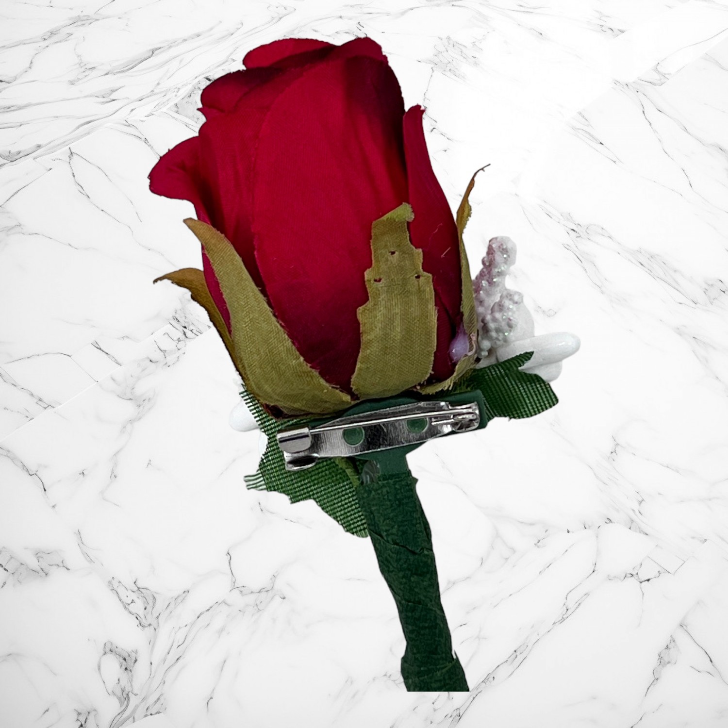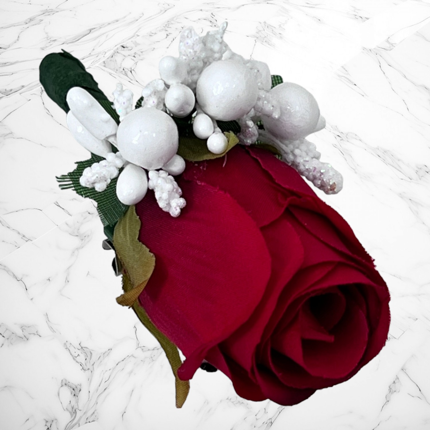 Aceste cocarde realizate din flori artificiale de trandafiri rosii sunt accesorizate cu ghiocei.