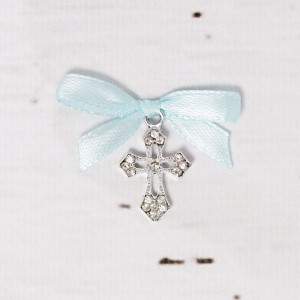 Pentru un botez de baiat, cruciulitele elegante cu mici strassuri si fundita bleu sunt o alegere mereu actuala.