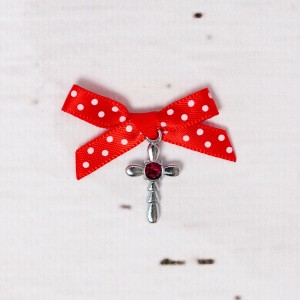 Cruciulitele botez cu strass rosu si fundita rosie cu buline sunt adesea folosite in biserica, la botezul fetitelor.