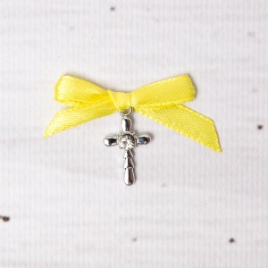 Cruciulitele cu fundita galbena se folosesc atat la botezul unei fetite, cat si a unui baietel. Micile obiecte crestine sunt oferite cadou invitatilor la biserica si purtate in piept de acestia pe parcursul slubei de botez.