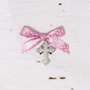 Aceste cruciulite botez argintii cu fundita roz prafuit si buline albe se pot oferi in dar la botezul unei fetite. Cea care le va oferi invitatilor este chiar nasa de botez. Aceste mici obiecte religioase se ofera la biserica, inainte de slujba propriu-zisa de botez.