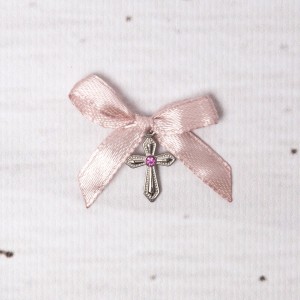 Deoarece culorile pastel sunt mereu in tendinte mai ales primavara, daca esti nasa unei fetite delicate, alege pentru botezul micutei cruciulite botez cu pietricica roz si fundita roz pudra.
