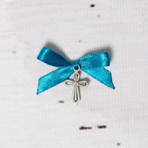 Pentru botezul unui baietel, nasa micutului poate sa aleaga cruciulite cu pietricica transparenta si fundita turcoaz pe care sa le ofere invitatilor. Cruciulitele sunt mici simboluri religioase pe care invitatii le primesc la biserica din partea nasilor de botez inainte sa inceapa slujba.