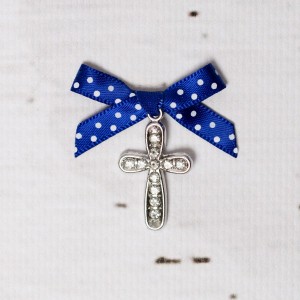 Alege pentru botezul unui baietel cruciulite botez cu strassuri transparente si fundita albastre cu buline albe si ofera-le, in calitate de nasa, invitatilor care asista la slujba de crestinare a finutului tau.