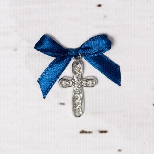 Daca esti nasa de botez a unui baietel si vrei ca ceremonia de botez sa fie perfecta, nu uita de micile detalii si cumpara cruciulite botez cu strassuri transparente si fundita bleumarin, cum este modelul din imagine.