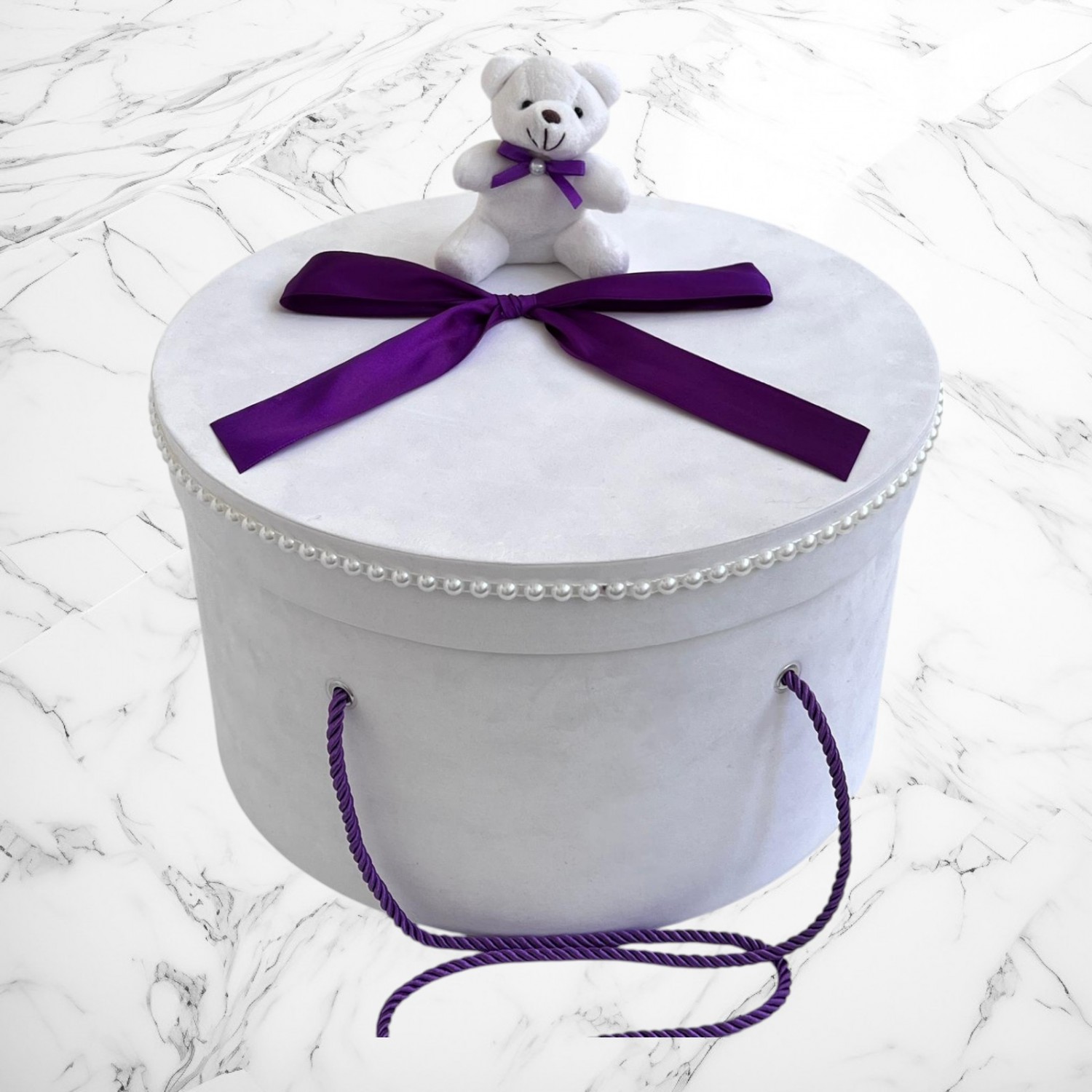 Păstrează hăinuțele și accesoriile de botez într-o cutie elegantă și adorabilă! Această cutie rotundă, de culoare albă, este special concepută pentru a adăposti cele mai frumoase amintiri ale micuțului tău. Decorată cu un ursuleț de plus moale și delicat, simbol al tandreței și iubirii, cutia adaugă un plus de farmec și rafinament momentului special al botezului.