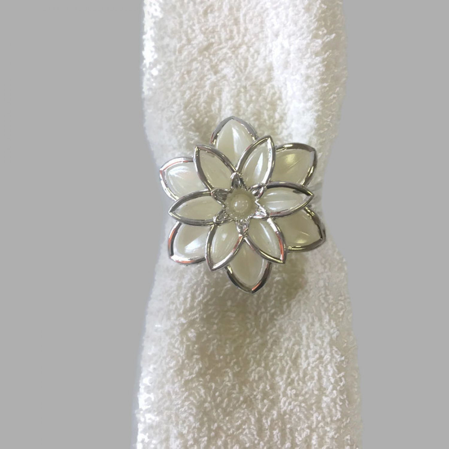 Inelele pentru servetele sunt realizate din metal argintiu, iar floarea alba este elementul distinctiv pentru o petrecere de vis. Aceasta simbolizeaza gingasia si puritatea copilasului.