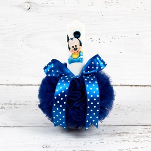 Pentru un botez in note vesele nasii unui baietel pot alege accesorii biserica in tonuri clasice, dar cu personaje de poveste sau desene animate celebre, cum ar fi lumanarea botez cu imaginea lui Baby Mickey Mouse, tulle albastru si panglica asortata cu buline.
