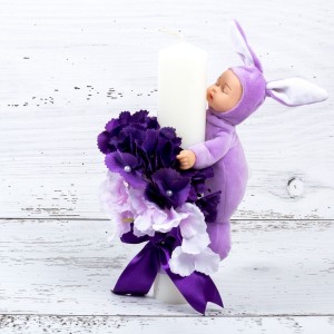 Lumanarea este decorata manual in Atelierul SelfEvents.ro cu o grija deosebita pentru detalii. Accesoriile folosite pentru decorul lumanarii sunt flori artificiale in nuante de lila si mov, panglica mov si figurina bebelus lila.