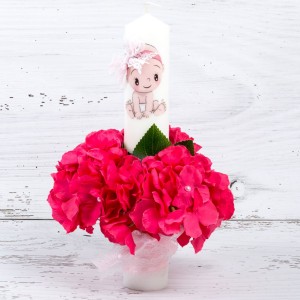 Aceasta lumanare botez cu imaginea unui bebelus cu fundita in par, flori roz care imprejmuiesc lumanarea ca o coronita si dantela la baza este alegerea ideala pentru botezul unei fetite.