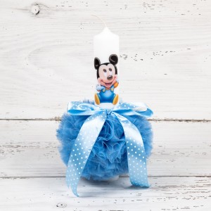Daca esti nasa de baiat, iar tema botezului este legata de personajele Disney, nu ezita sa alegi o lumanare biserica cu imaginea micutului Mickey Mouse, tulle bleu si funda satinata bleu cu buline.