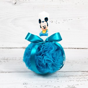 Daca esti nasa de baiat, iar tema botezului este legata de personajele Disney, nu ezita sa alegi o lumanare biserica cu imaginea micutului Mickey Mouse, tulle si panglica turcoaz.