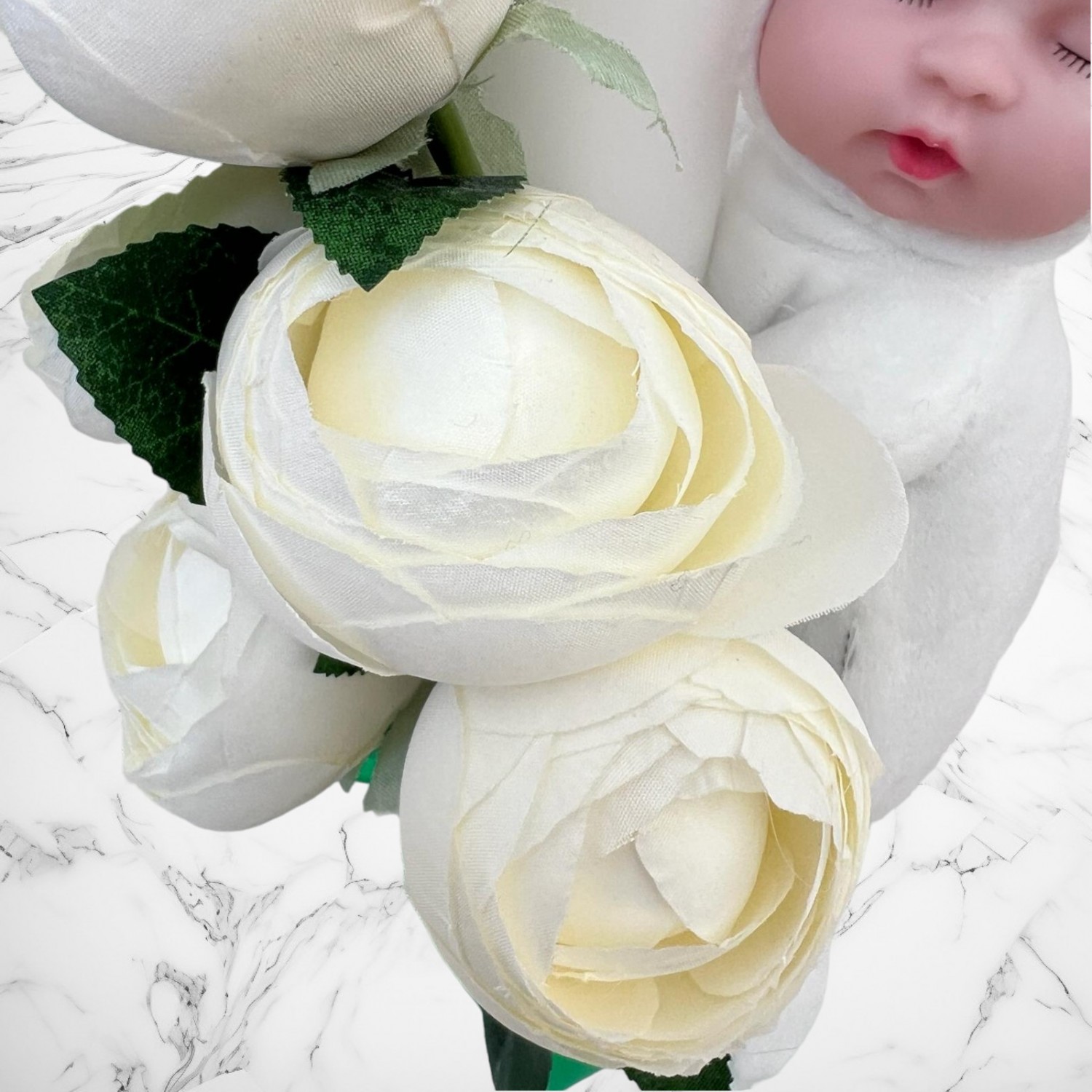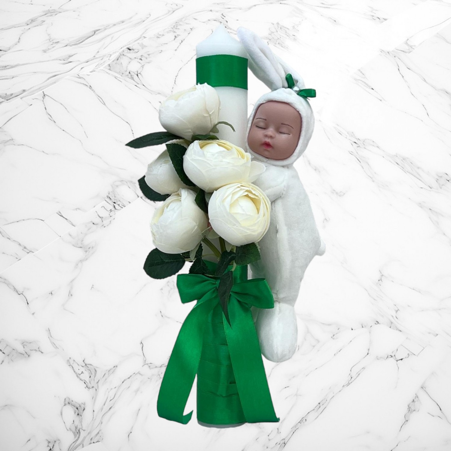 Lumanarea este accesorizata cu o jucarie bebelus imbracat in iepuras.