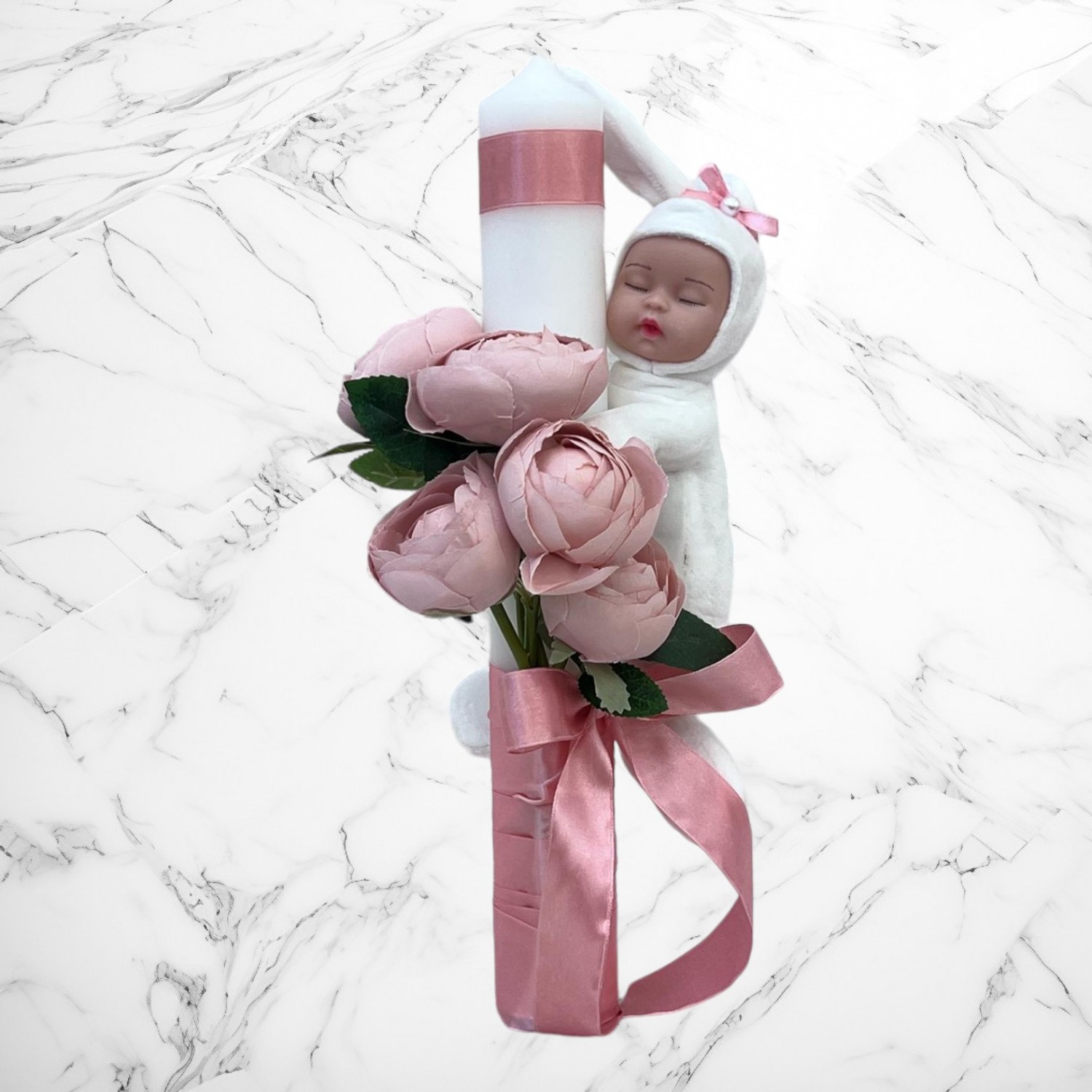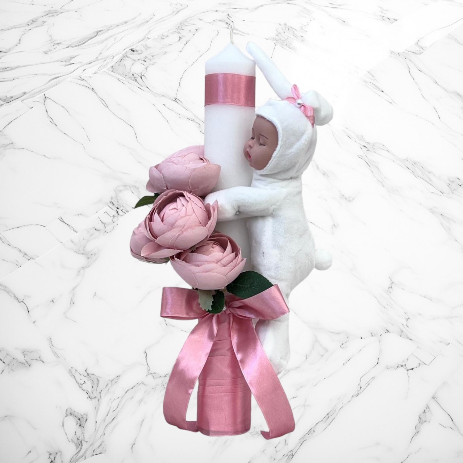 Lumanarea este accesorizata cu o jucarie bebelus imbracat in iepuras.