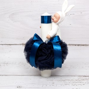 Lumanarea botez cu tulle bleumarin si bebelus este un cadou binevenit din partea parintilor spirituali pentru finutul lor.