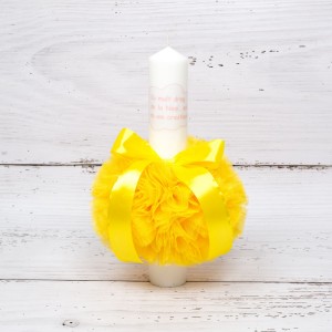Prin urmare, nasii copilului pot alege pentru biserica o lumanare in culori vibrante, dar neutre, cum ar fi aceasta lumanare cu tulle galben, panglici satinate in aceeasi culoare si mesajul sugestiv: ”Cu mult drag de la nasi/Azi m-am crestinat”.
