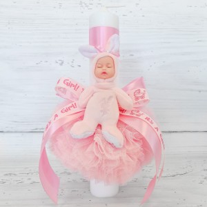 Lumanarea are in partea superioara o panglica din satin in aceeasi culoare cu tulle-ul si una cu mesajul It's a girl iar bebelusul care poarta un costumas cu urechi de iepuras.