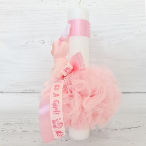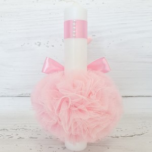 Lumanarea pentru botez cu decor din tulle si bebelus imbracat in costumas roz este o alegere eleganta pentru ceremonia de botez a micului crestin.