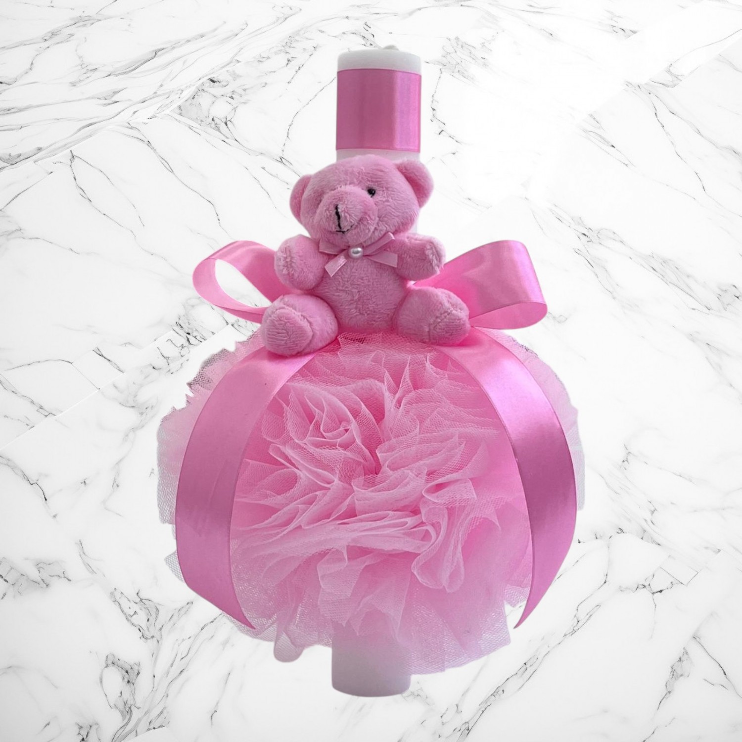 Comanda acum produsul "Lumanare botez decor tulle si ursulet plus roz".