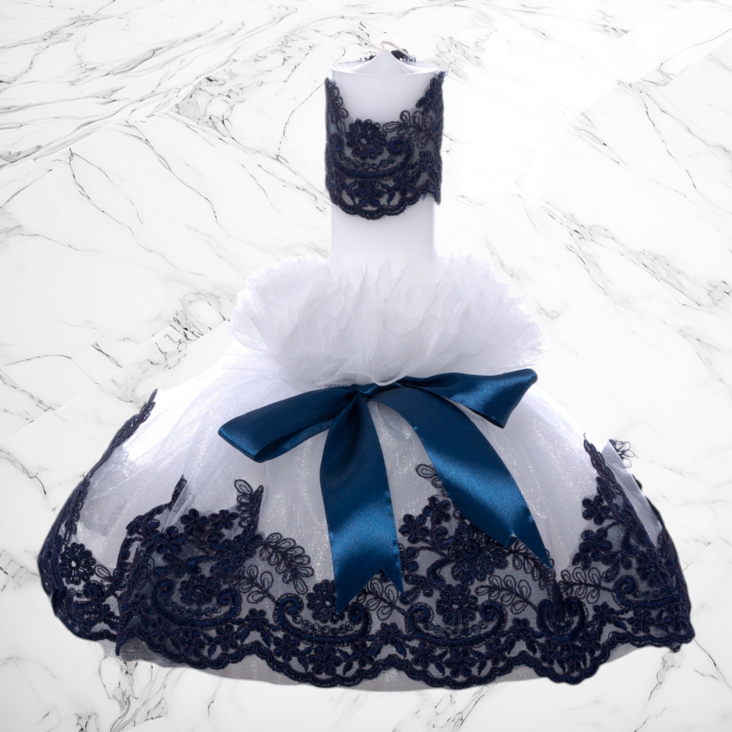 Lumanarea botez cu tulle alb si dantela bleumarin este un cadou binevenit din partea parintilor spirituali pentru finutul lor.