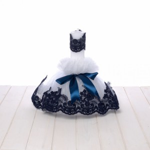 Lumanarea cu decor bicromatic este finisata manual cu tulle alb (simbol al puritatii) si dantela bleumarin (culoarea este specifica baietilor).