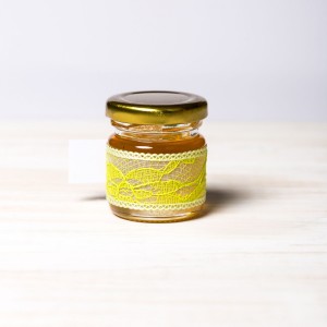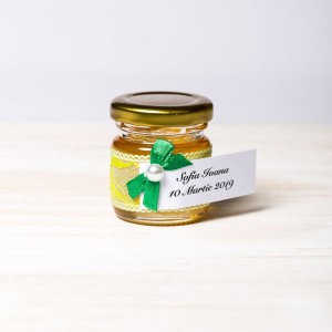 Marturiile borcanele miere cu dantela galbena, fundita verde si perluta alba sunt o alegere ideala pentru evenimentele care au in prim plan decorul in galben si verde.