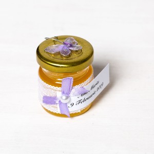 Marturiile de nunta borcanele miere cu fluture lila sunt perfecte pentru o nunta cu tema romantica, programata in sezonul cald. Fluturele simbolizeaza renasterea naturii. Fundita lila, dantela alba si perluta asortata intregesc decorul acestor marturii elegante.