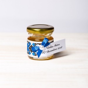 Daca organizezi o nunta rustica si vrei sa oferi invitatilor marturii de nunta cu motive traditionale, alege borcanele umplute cu miere si decorate festiv cu o banda lata cu decor popular in negru si albastru.