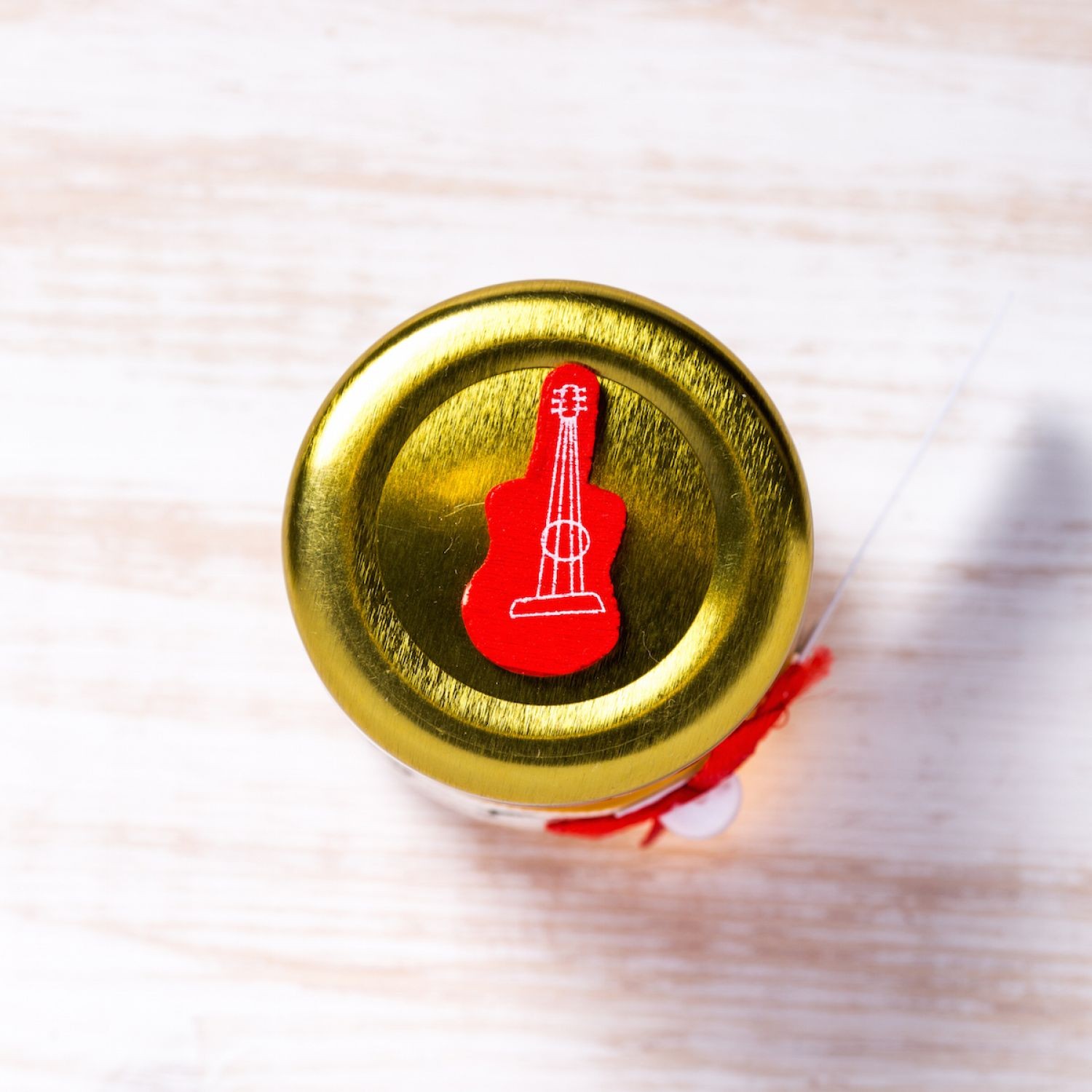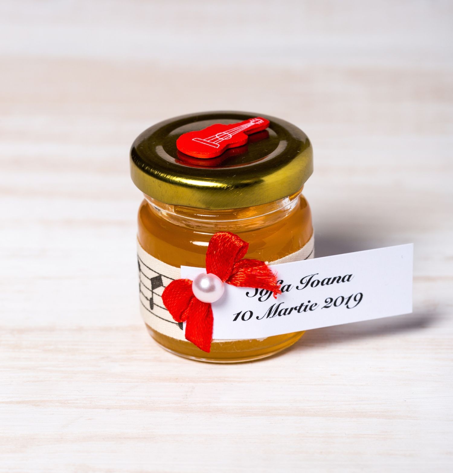 Pentru o nunta cu tema muzicala, cea mai buna alegere sunt marturiile borcanele miere cu decor note muzicale si chitara rosie.
