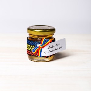 Marturiile borcanele miere cu banda neagra in trei culori (rosu, galben si albastru), mesajul scris Romania si fundita tricolor reprezinta un cadou deosebit, ce lasa o impresie puternica asupra invitatilor. Marturiile au fundita tricolor.