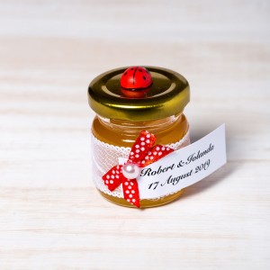 Marturiile borcanele miere sunt cea mai buna alegere, mai ales daca au o figurina vesela pe capac, cum ar fi o buburuza.