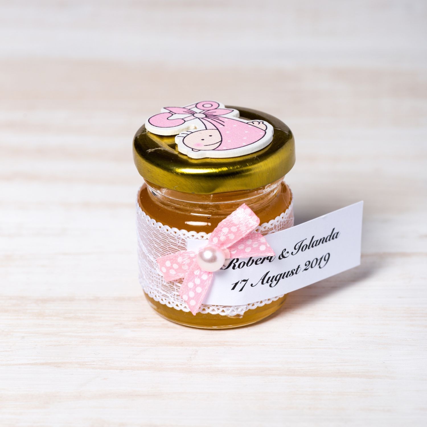 Aceste borcanele miere decorate festiv cu dantela alba, fundita roz cu buline albe, perluta alba si figurina bebelus roz pe capac sunt cadourile perfecte pentru prima petrecere importanta din viata unei fetite.