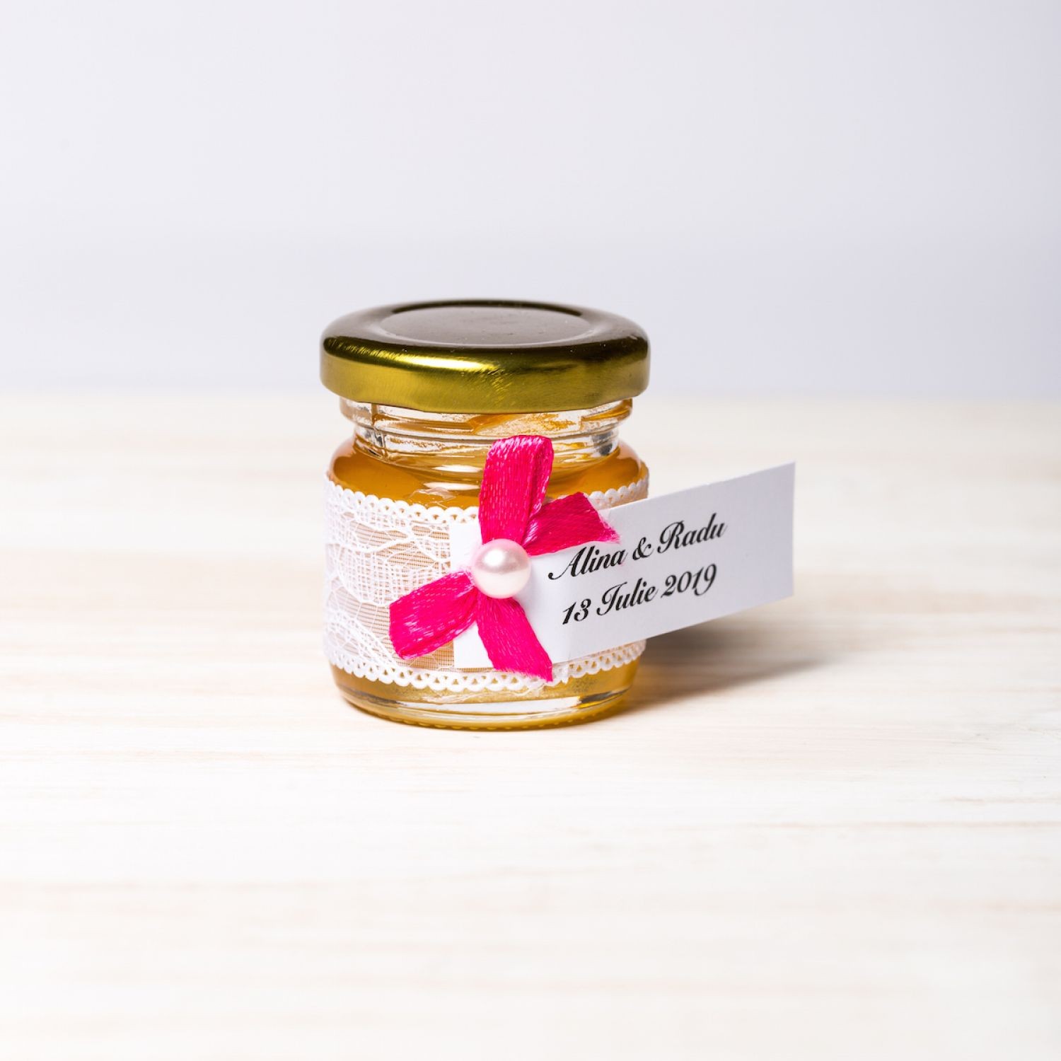 Pentru prima petrecere importanta din viata fetitei voastre, alege pentru invitatii prezenti la restaurant pentru a celebra crestinarea bebelusei, marturii botez borcanele miere cu dantela alba, fundita roz fucsia si perluta asortata.
