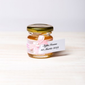 Pentru ca sunt printre cele mai populare marturii de botez, parintii unui bebelus proaspat crestinat pot alege pentru prima petrecere importanta din viata fetitei lor borcanele miere cu decor in alb si roz. Aceste marturii elegante vor face o impresie frumoasa printre invitati.