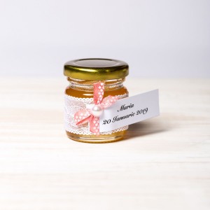 Marturiile borcanele miere cu dantela alba si fundita piersica cu buline albe sunt sugestive pentru botezul unei fetite dragalase.