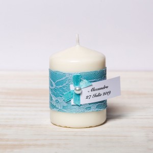 Marturiile lumanari se ofera invitatilor in semn de multumire pentru prezenta lor la eveniment, personalizate cu o eticheta pe care se trece numele copilului si data botezului/ data nasterii.