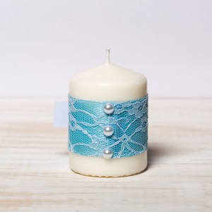 Marturiile lumanari botez cu decor bleu sunt alegerea perfecta pentru botezul unui baietel. Acestea au o banda lata din dantela bleu cu model floral, fundita bleu asortata si patrujumatati delicate de perlute albe.