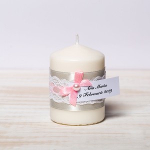 Decorate manual in culori placate, marturiile de botez au o banda lata din satin argintiu lipita de lumanare, o banda alba din dantela fina si un snur roz care se leaga sub forma unei fundite.