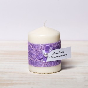 Pentru parintii de fetite care vor sa gaseasca o alternativa la marturiile cu decor roz, o alegere inspirata sunt marturiile botez lumanari cu banda dantela si fundita lila cu jumatate perla in mijloc.