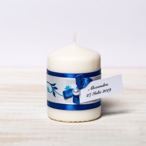 Daca la botezul baietelului tau ai multi invitati pe care vrei sa ii impresionezi in mod placut cu cele mai frumoase marturii amintire, o poti face alegand marturii botez lumanari decorate festiv cu o banda albastra din satin, o banda alba cu floricele in nuante de albastru si bleu si o fundita albastra din satin cu perluta in mijloc.