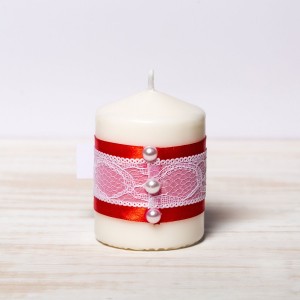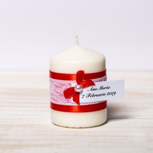 Daca vrei sa iti surprinzi invitatii cu cadouri utile, alege marturii lumanari botez, decorate manual cu banda rosie lata din satin, o banda de dantela alba, fundita asortata si perla in mijloc.
