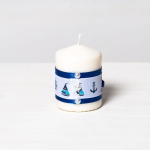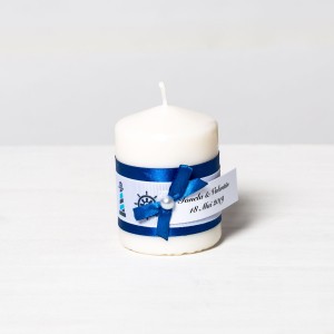 Lumanarile au decor predominant albastru, dar elementele care ies in evidenta sunt simbolurile marine: farul, barcutele cu panza, ancora si timona.