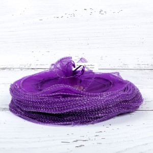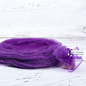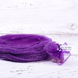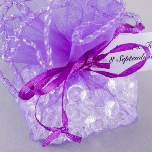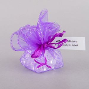 Saculetii din organza se asigura cu un snur satinat in aceeasi culoare cu saculetul. Marturiile de culoare mov sunt perfecte pentru botezul unei fetite care poarta o rochita in aceasta culoare placuta si accesorizata cu fir irizant de culoare argintie.